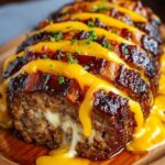 After the second baking period, remove the meatloaf again. Arrange the remaining sharp cheddar slices or shredded cheese neatly over the glazed top. Return the loaf to the oven one last time for about 5 to 10 minutes, or until the cheese is beautifully melted, bubbling, and just starting to brown at the edges. The internal temperature should read 160°F (71°C) when fully cooked.